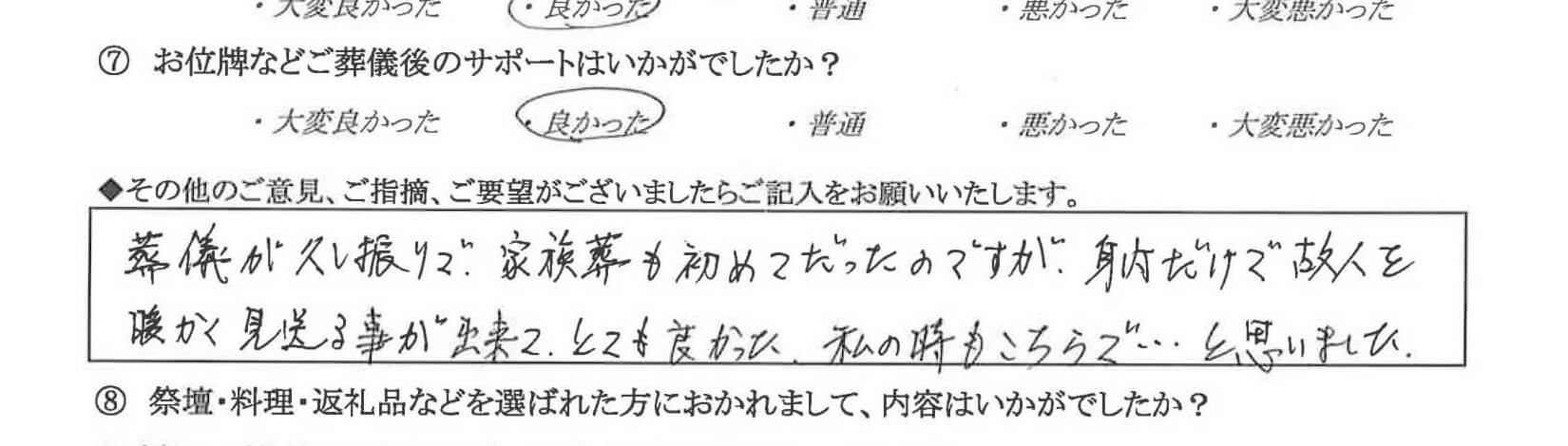 葬儀が久しぶりで、家族葬も初めてだったのですが、身内だけで故人を温かく見送ることができてとても良かった。私のときもこちらで…と思いました。